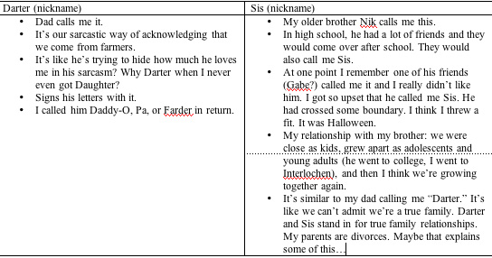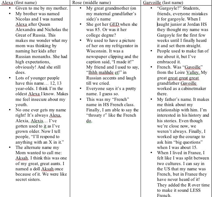 - Name chart head start. Students received their homework, a Name Chart (download here: My Name Chart). After seeing how many people defined themselves by their names versus their bodies, minds, or spirits, we began to explore how sometimes our name suits us, and sometimes it doesn’t. More specifically, we brainstormed the different memories, feelings, sights, sounds, thoughts, etc. that come along with each of our many names. We all have many names: our full name, our petnames, our home name, our name our friends call us. In the name chart students write down whatever they know, think, or feel about each of their names. Here is an example: