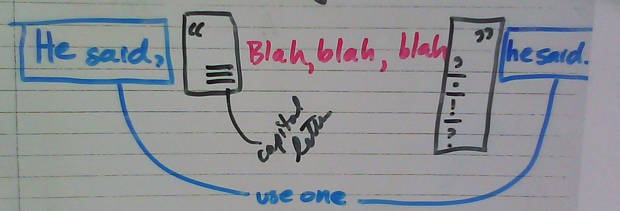 The He said, and he said. in blue mark the beginning or end of dialogue. You do not always need to use these. The opening quote is always followed by a capital letter (that’s what the three lines mean) because the person speaking is starting their sentence. The closing quote always follows some form of punctuation, either a comma, period, exclamation point, or question mark. It must have punctuation inside the quote; it wants to hold that punctuation lovingly, wrapping its two little quotation arms around it. If there’s no punctuation, the quotation mark gets lonely.