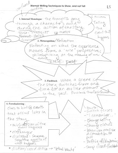2. Pass in homework. Students read example memoirs and labeled the use of reflection, flashback, and internal monologue. If you were absent, you should turn this in to Ms. Garvoille. Students who did not complete this need to finish it for next class for lower credit.