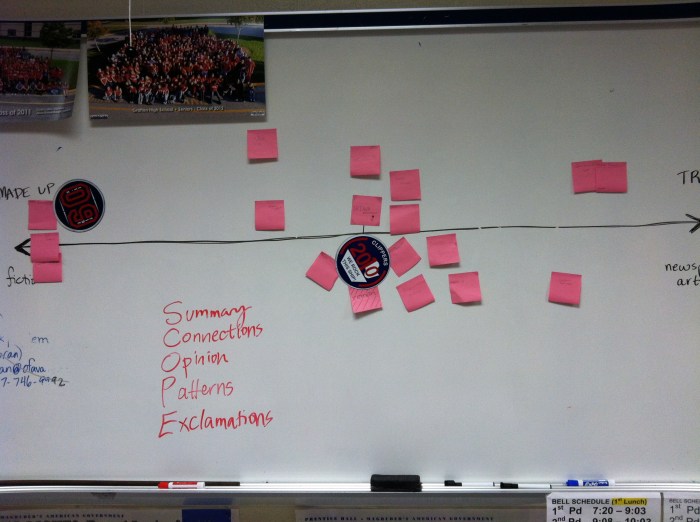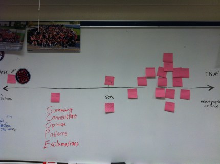 5. Truth in memoir. Students wrote for two minutes to the prompt, “What percentage of a memoir needs to be true? How much fiction is okay in a memoir?” We watched two clips of videos related to how much of a memoir needs to be 100% factually accurate. First we watched Michael Moore talk about his memoir Here Comes Trouble with Stephen Colbert (start at 3:24). Then, we watched an interview with James Frey, author of A Million Little Pieces. Here are some segments of that interview with Larry King (watch it all). After watching, students wrote for one minute to this prompt: James Frey says he stands by the “essential truth” of his memoir, even though there were embellishments and difference. Students then put their name on a sticky note and placed themselves on a continuum of where a memoir belongs in veracity from “fiction” to “newspaper article,” from 0% truth to 100% truth. Here’s what we came up with: