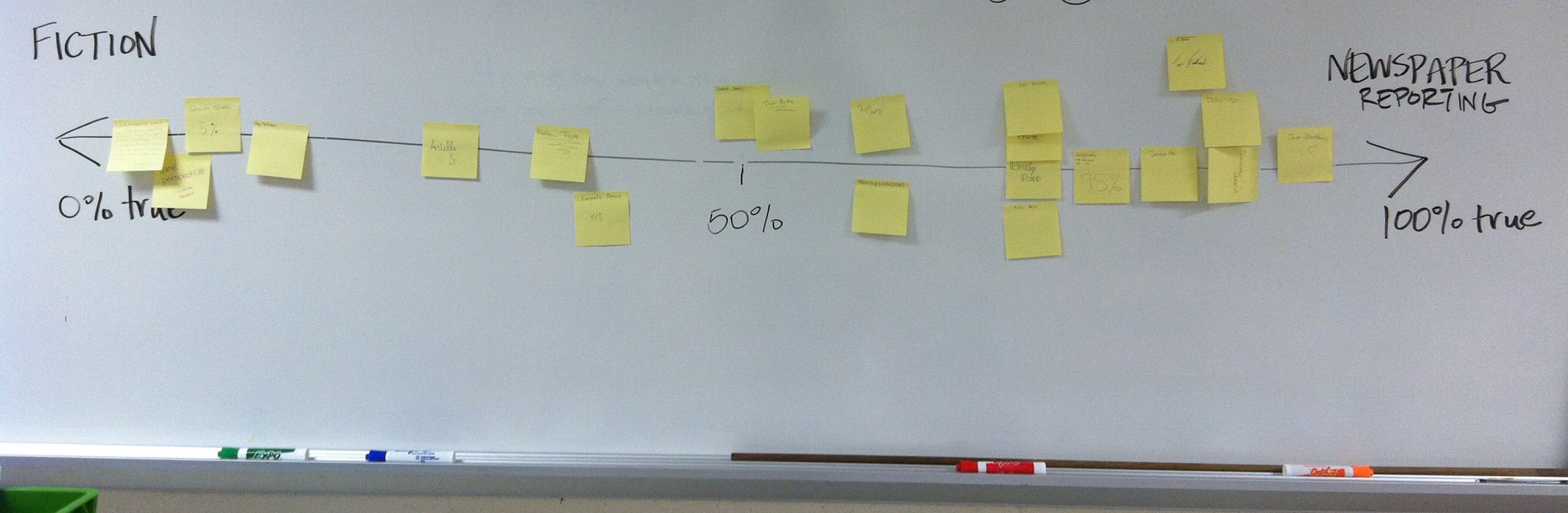 3. What’s truth in memoir? continued. We watched an interview with James Frey, author of A Million Little Pieces. Here are some segments of that interview with Larry King (watch it all). After watching, students wrote for one minute to this prompt: James Frey says he stands by the “essential truth” of his memoir, even though there were embellishments and difference. What does he mean by “essential truth”? How is that different from just “the truth”? Students then put their name on a sticky note and placed themselves on a continuum of where a memoir belongs in veracity from “fiction” to “newspaper article,” from 0% truth to 100% truth; this is, of course, after we had initially answered that question last Friday. Many perspectives changed after reading “Memory and Imagination.” Here’s what we came up with: