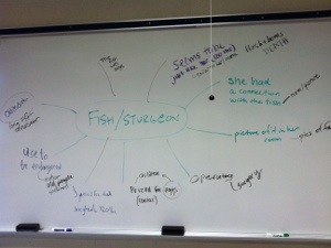3. Symbolism of sturgeon. Students created a web in their notebooks and, with their partners, listed the characteristics of the sturgeon. Then, some students added those characteristics to the board.