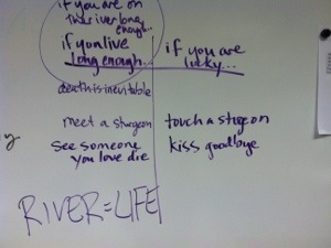 6. Final paragraph. Students read the very last paragraph aloud. Then, we made a T-chart at the end of the text. On one side we listed “If you are on the river long enough/If you live long enough” and on the other side we listed “If you are lucky.” This helped us figure out how the author gained closure from the experience.