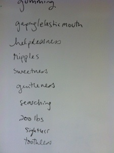 4. Diction. I read students two paragraphs from the memoir that described the sturgeon and asked them to circle all the words that reminded them of a person. Here were the words: