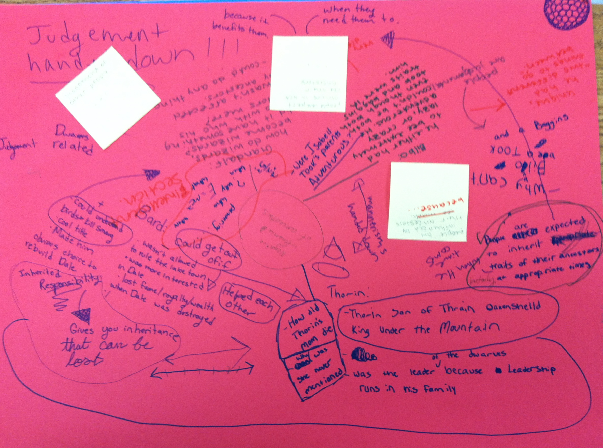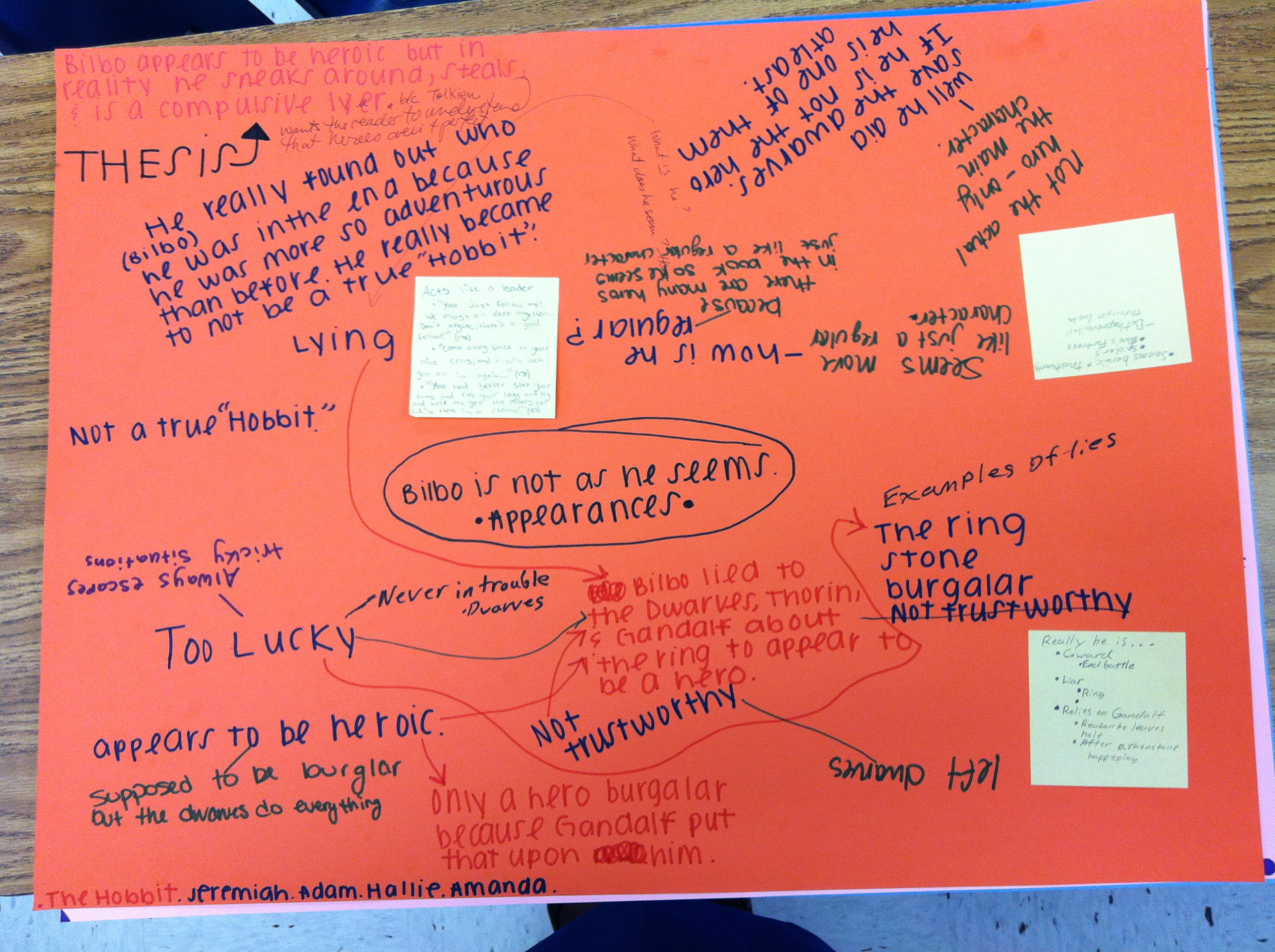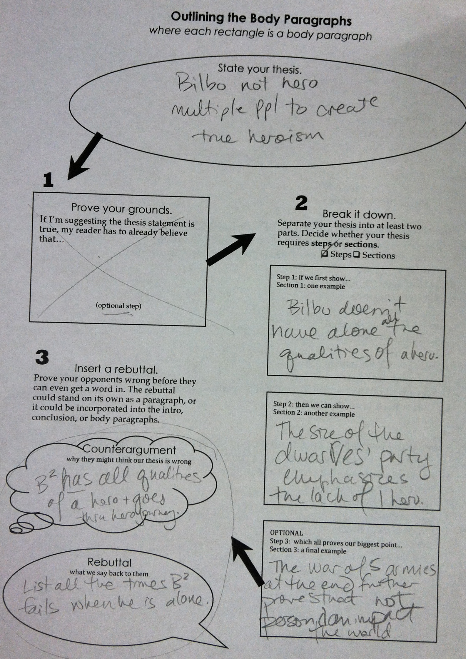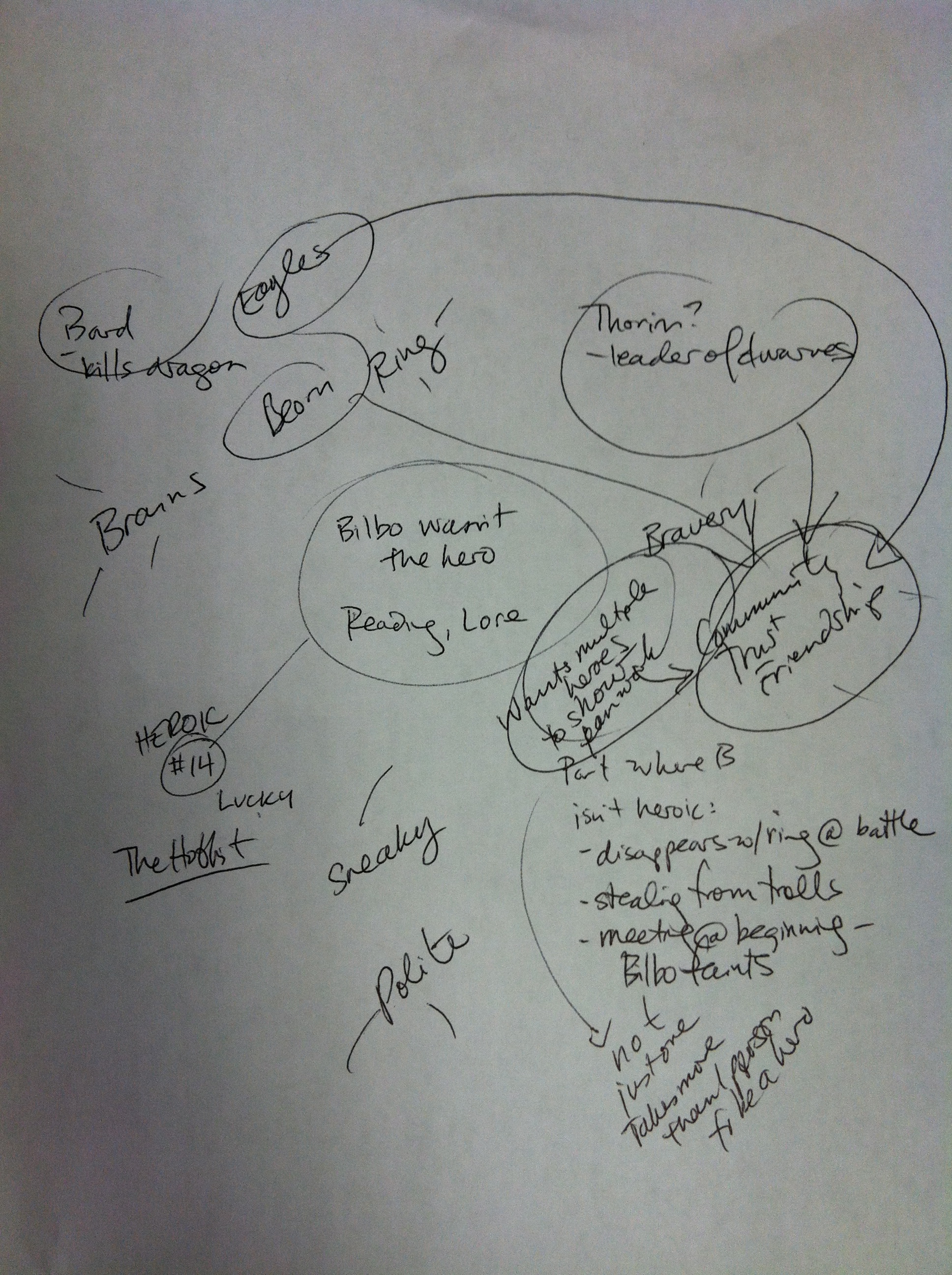 4. Ms. Garvoille then demonstrated how to turn an issue into a thesis. Her issue was the fact that Bilbo did not seem very heroic. Then she made an idea chart: