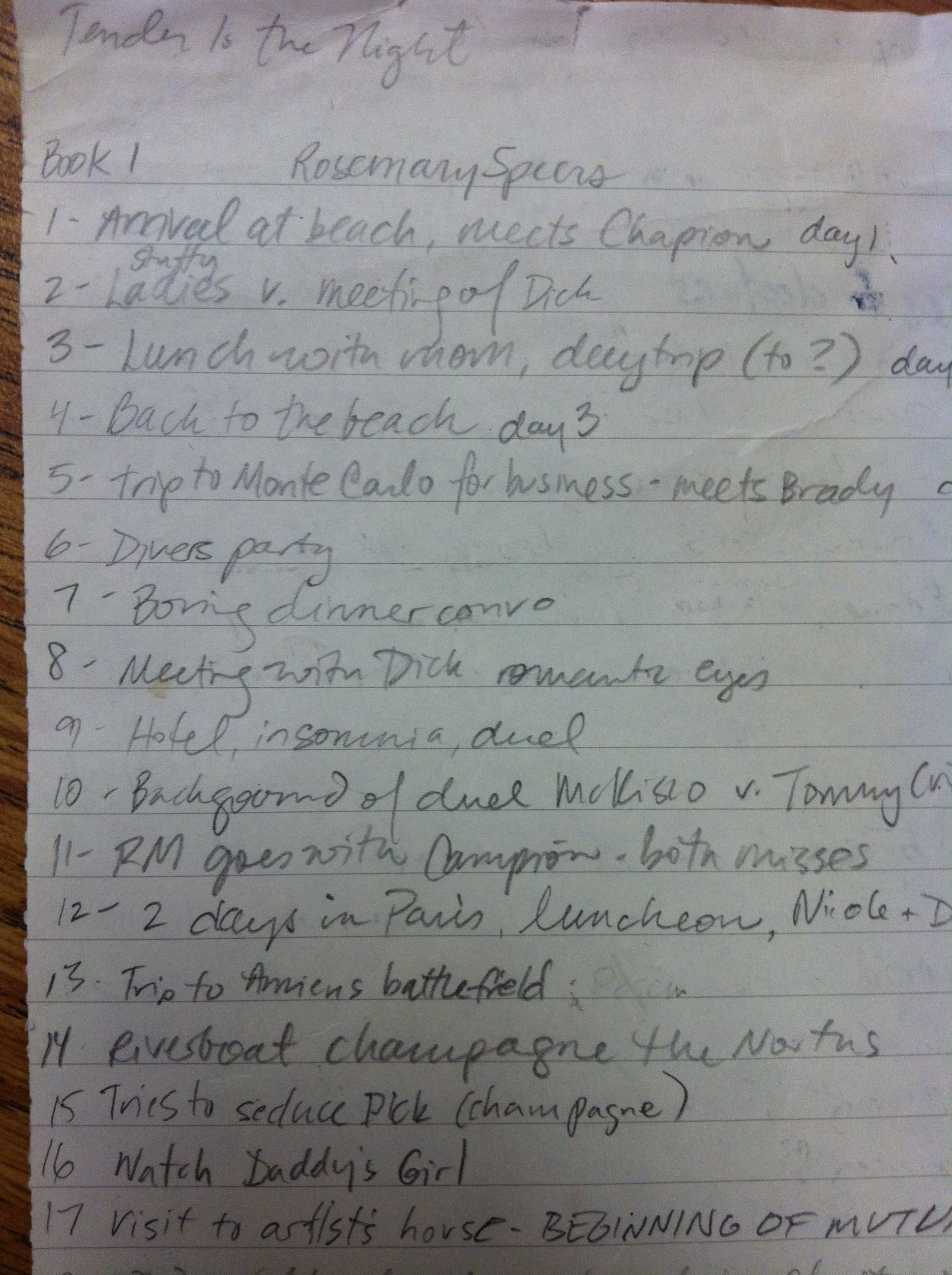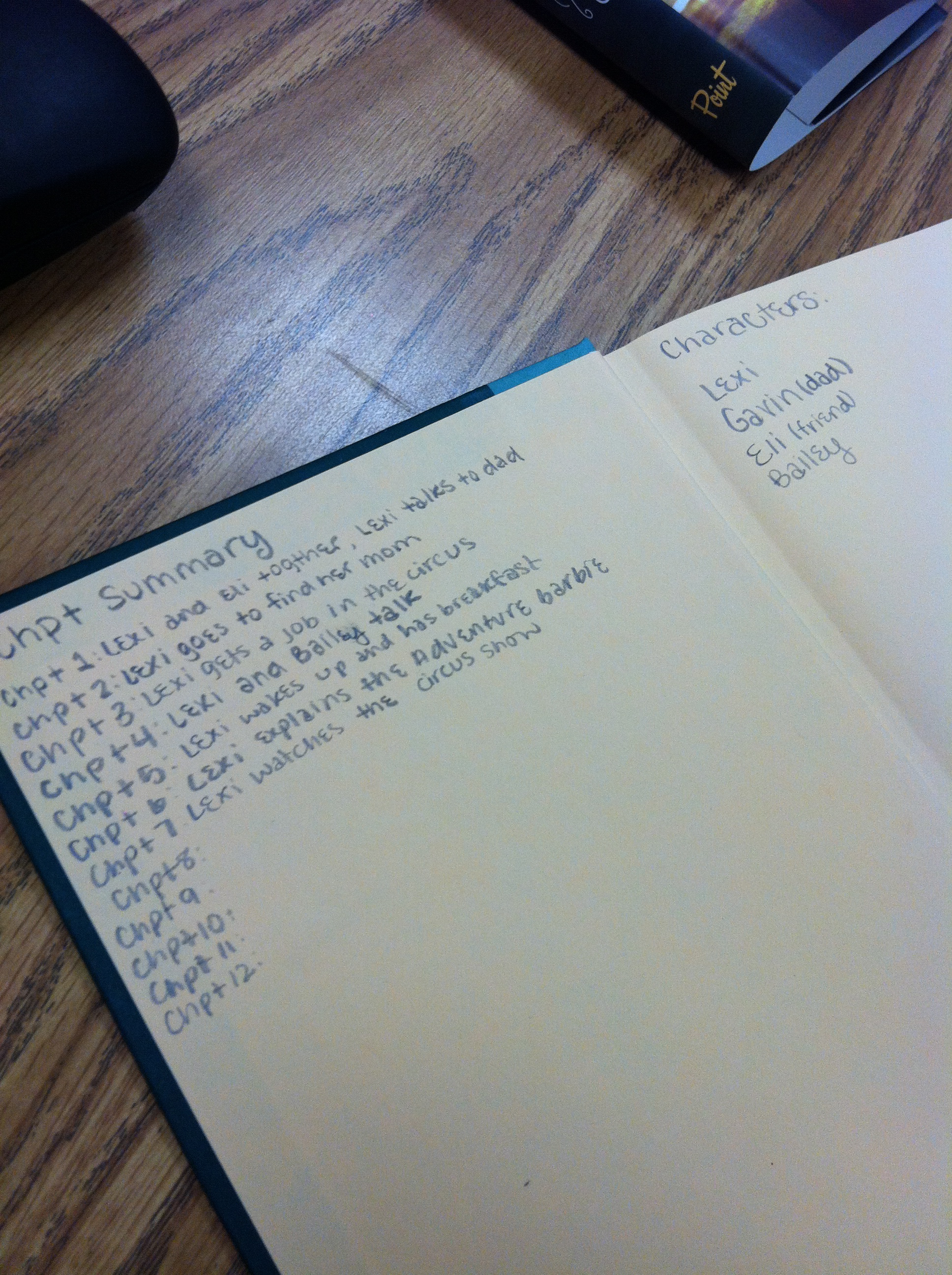 Everyone must keep a chapter outline, where you write an extremely brief summary of each chapter. Here are some of mine: