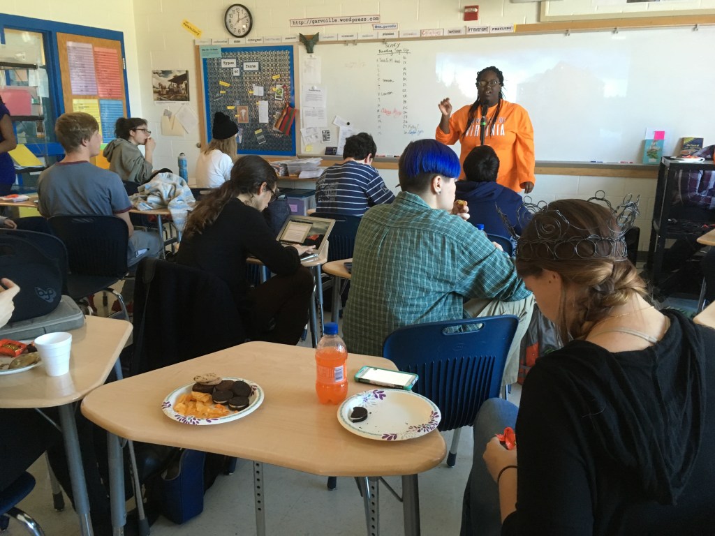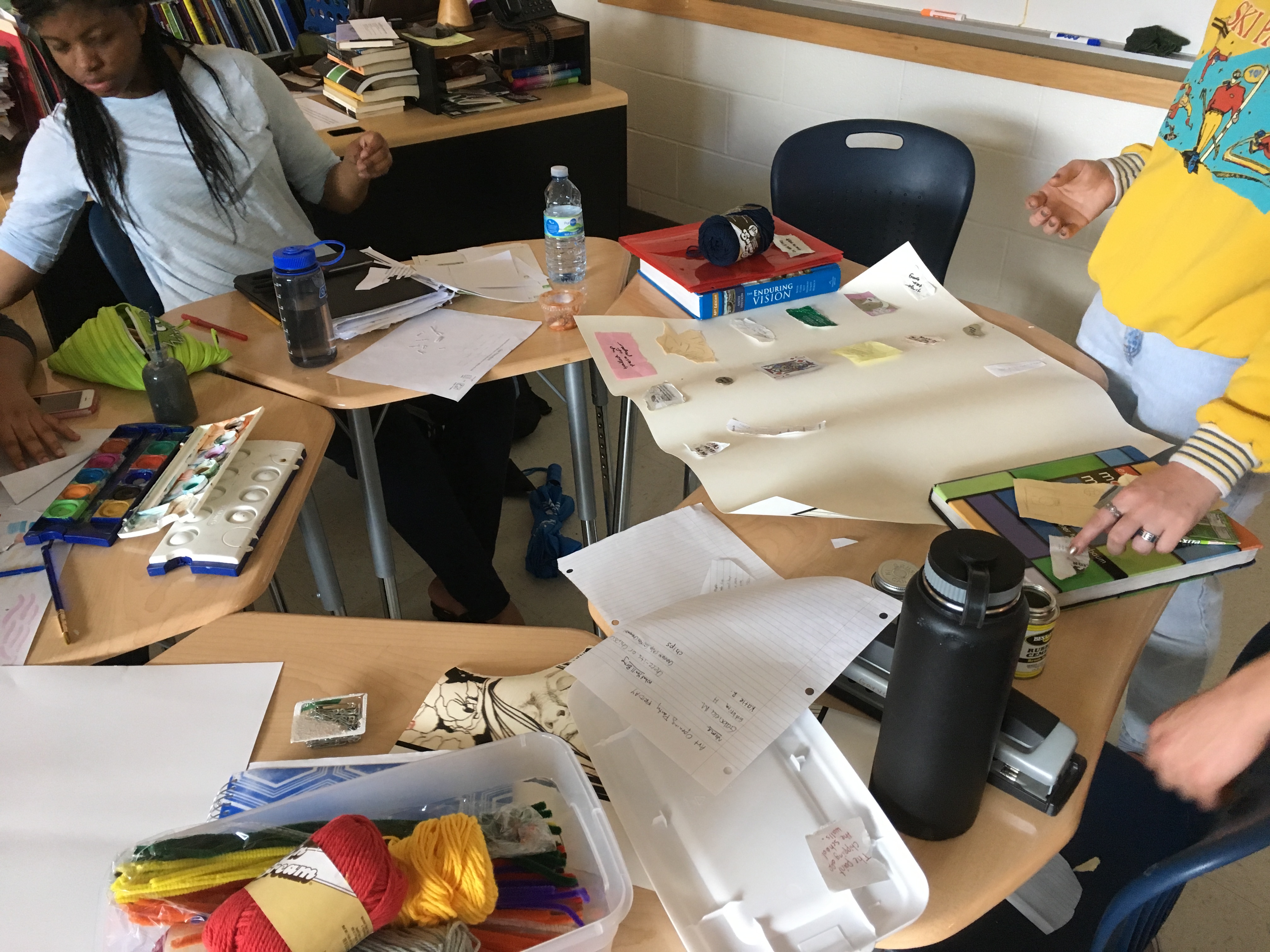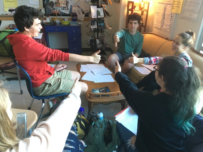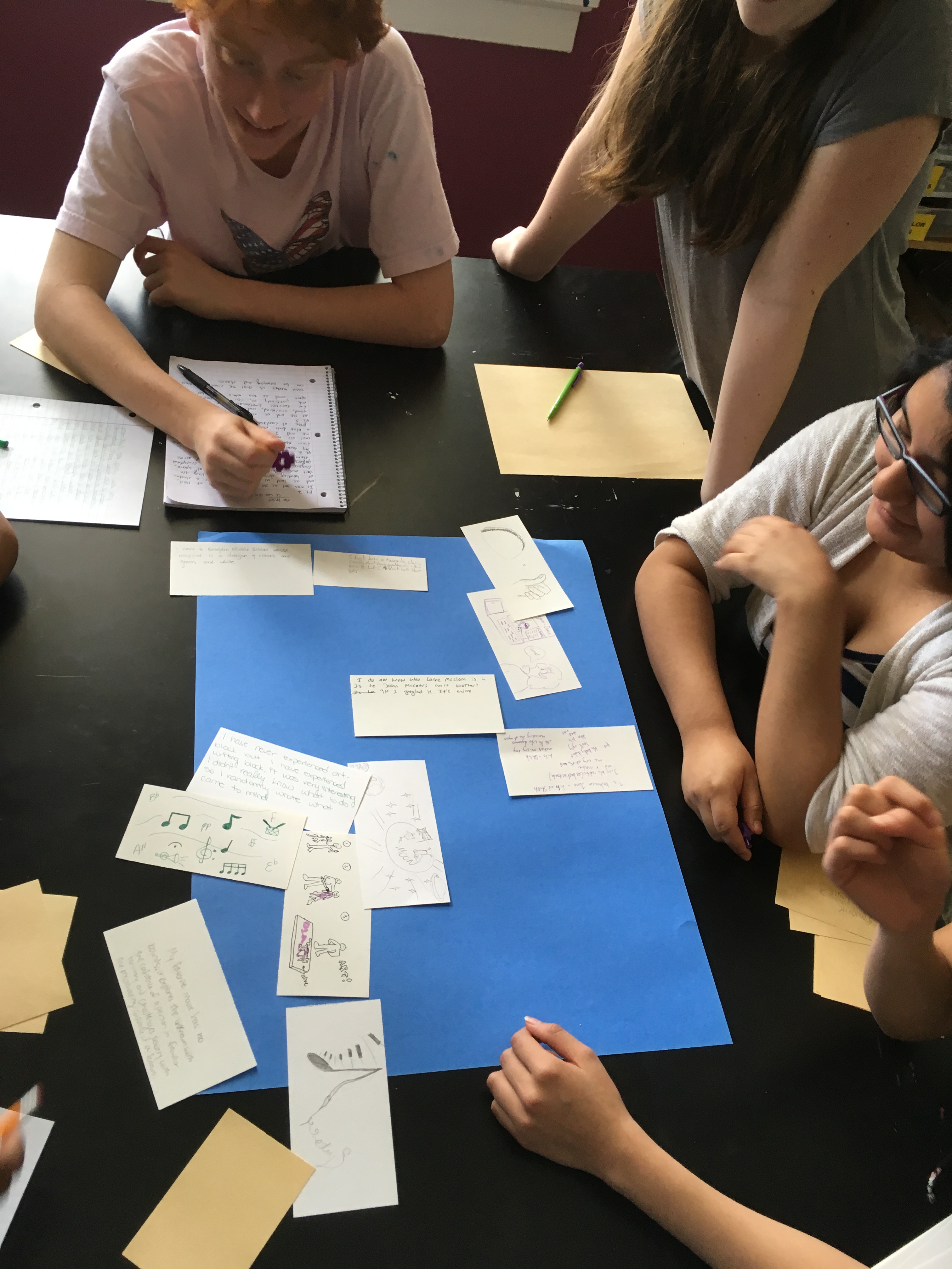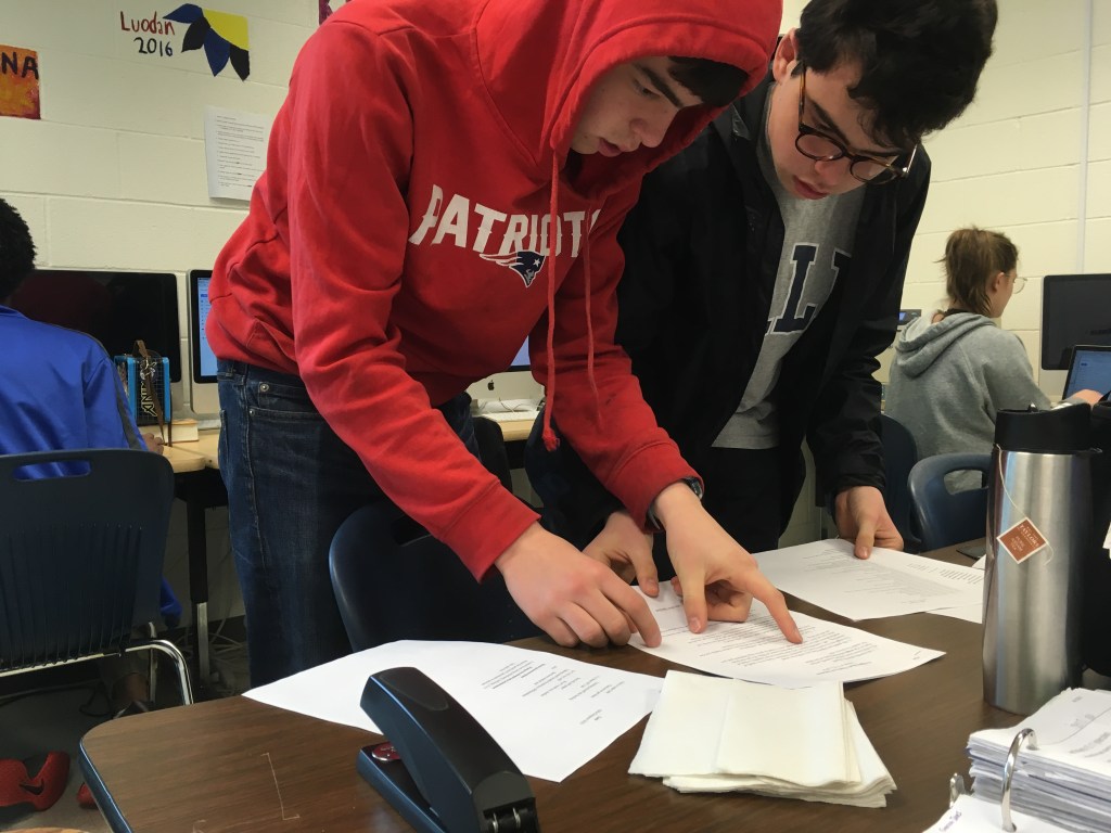 Creative writing and intermediate 2D students collaborated in a multi-week exploration of how artists and writers integrate process into their thinking. The collaboration kicked off with a TASK party, then students formed groups based on thematic interests. Over the course of the next few weeks, small groups developed their own processes that culminated in a gallery show.