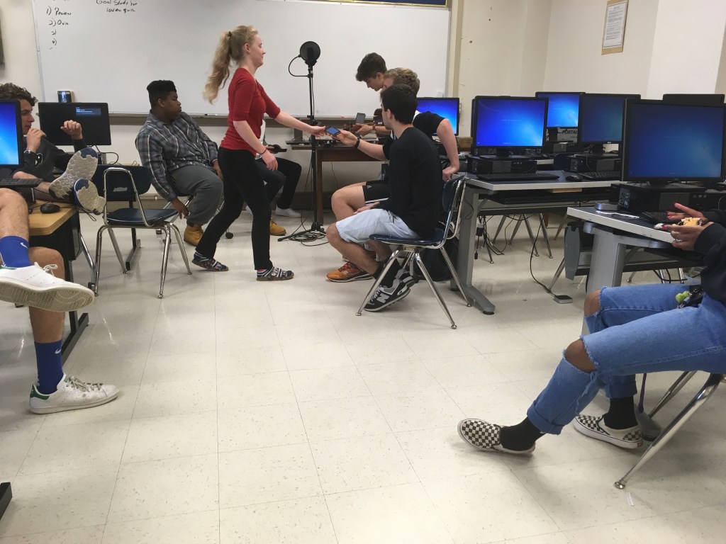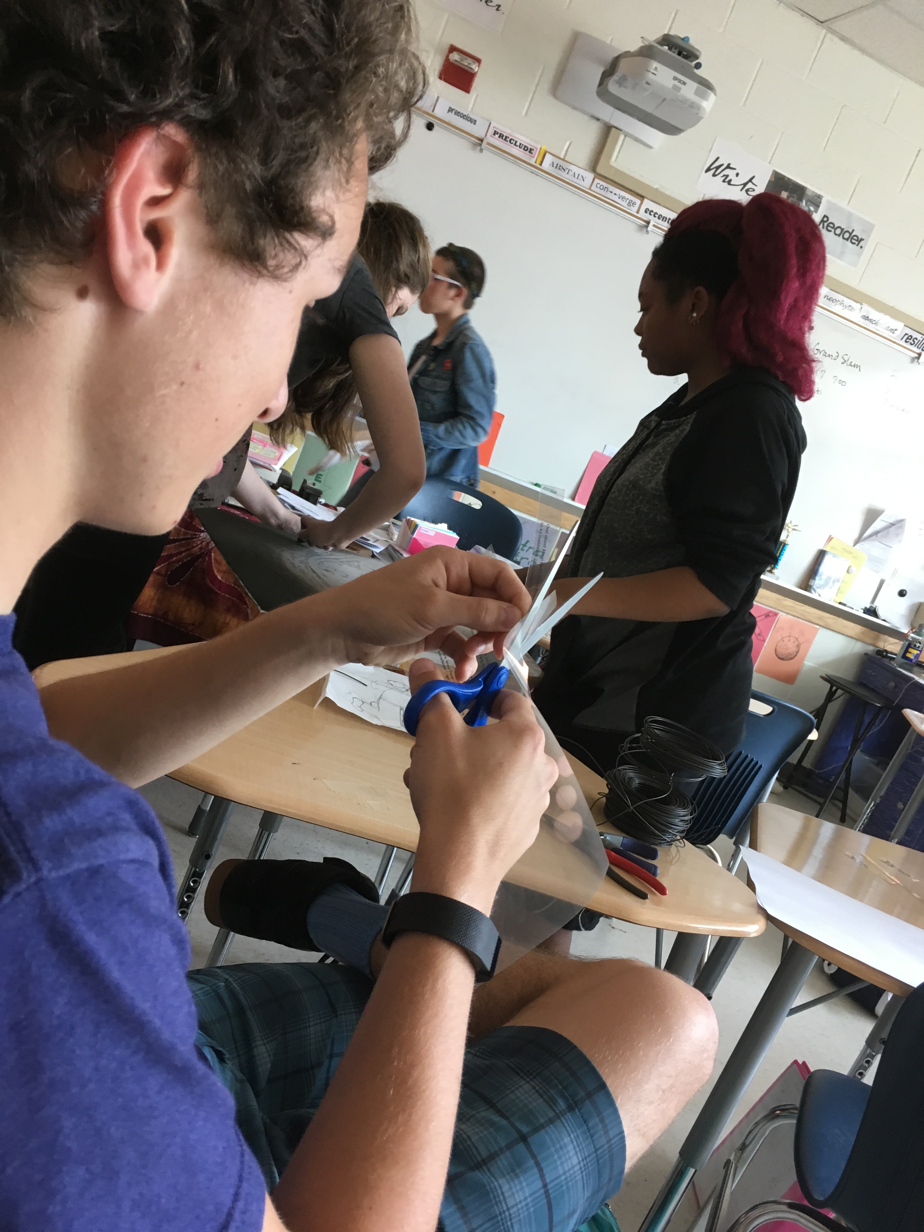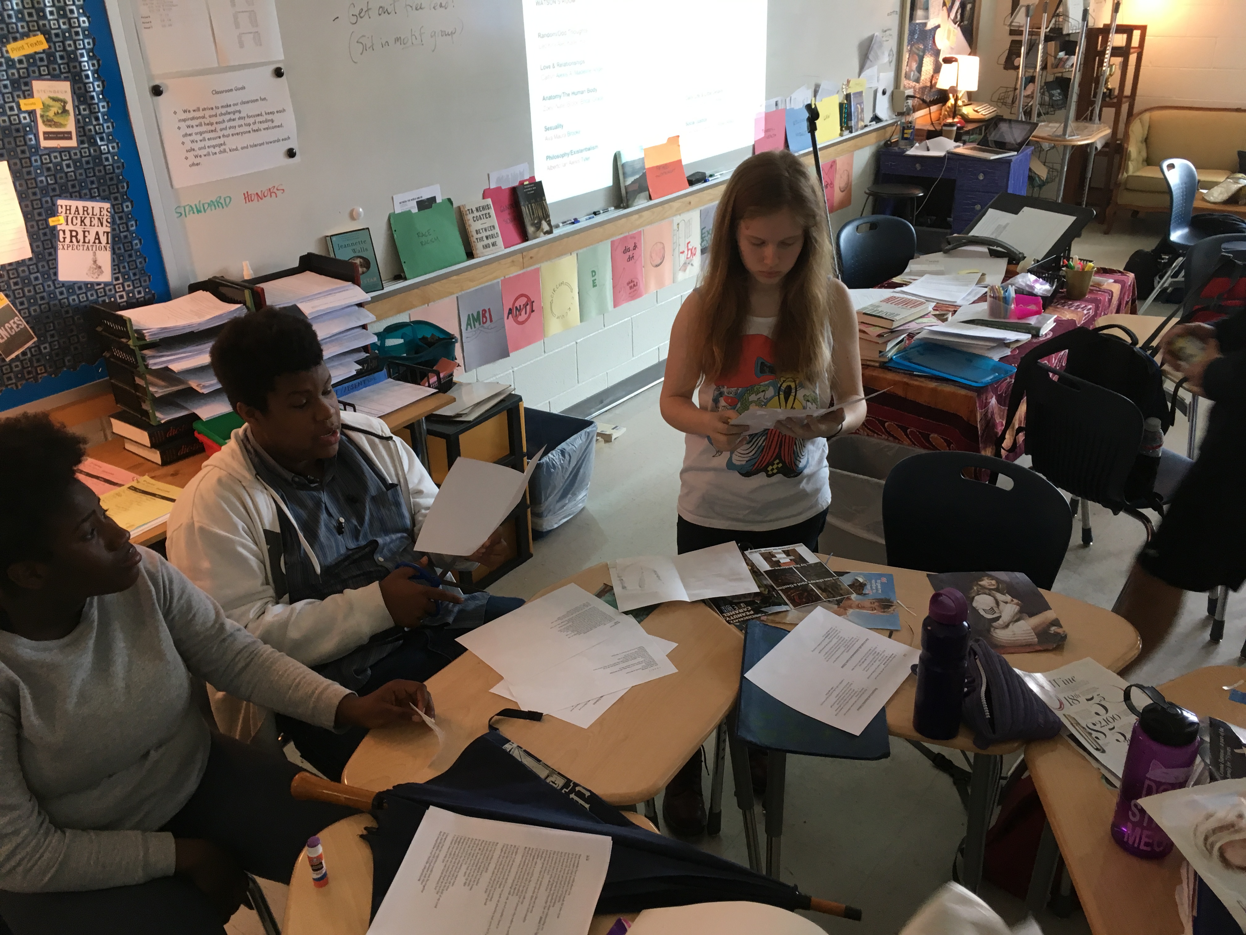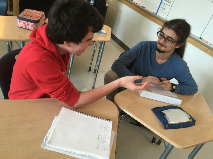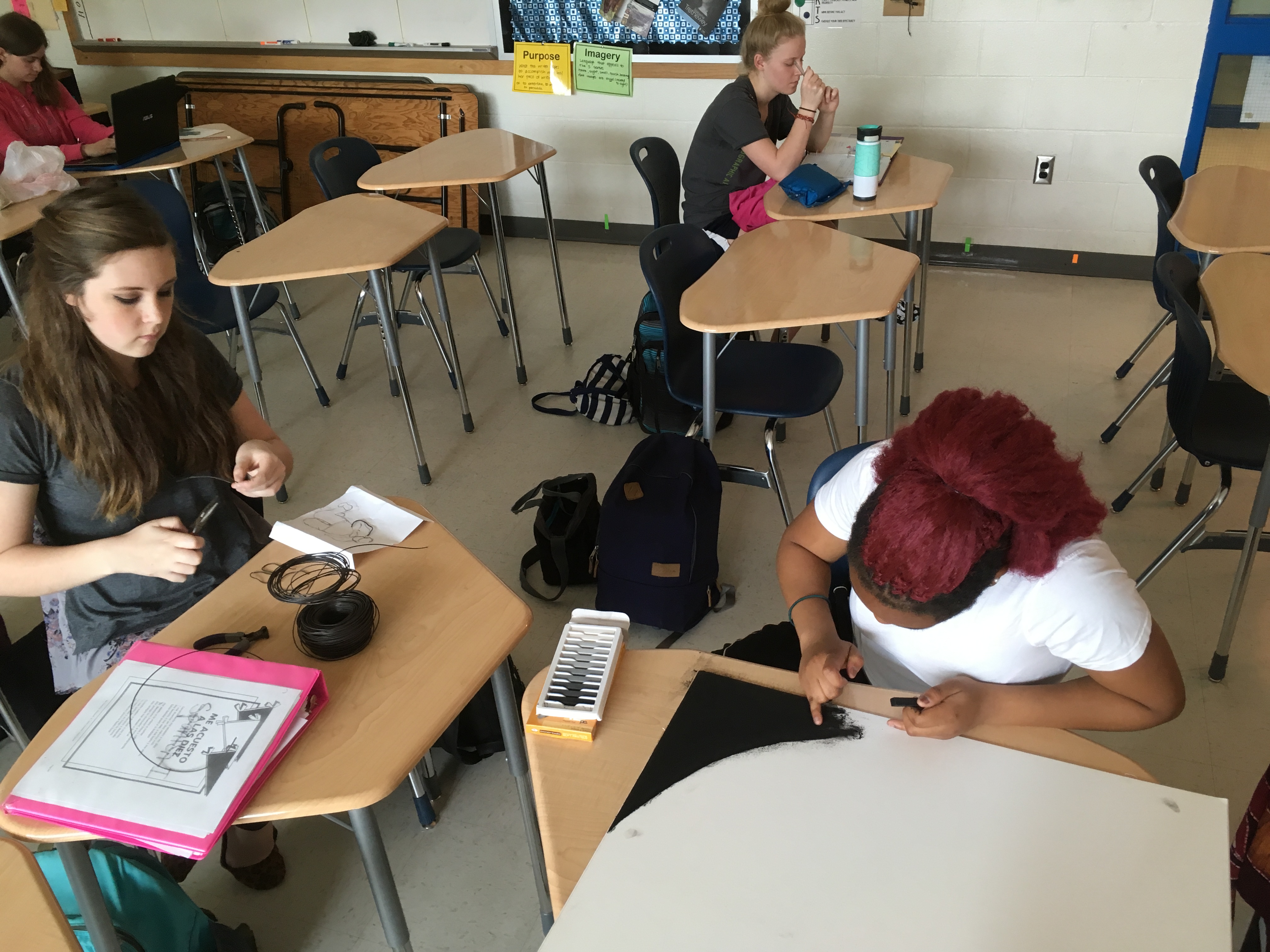 Creative writing and intermediate 2D students collaborated in a multi-week exploration of how artists and writers integrate process into their thinking. The collaboration kicked off with a TASK party, then students formed groups based on thematic interests. Over the course of the next few weeks, small groups developed their own processes that culminated in a gallery show.