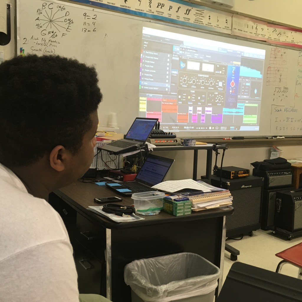 High school creative writers collaborated with the guitar program to created a spoken-word album produced by JAMM, a student musician. This month-long project incorporated concept brainstorming, group writing sessions, meeting with musicians, recording on professional software, and designing an album insert featuring student artwork.